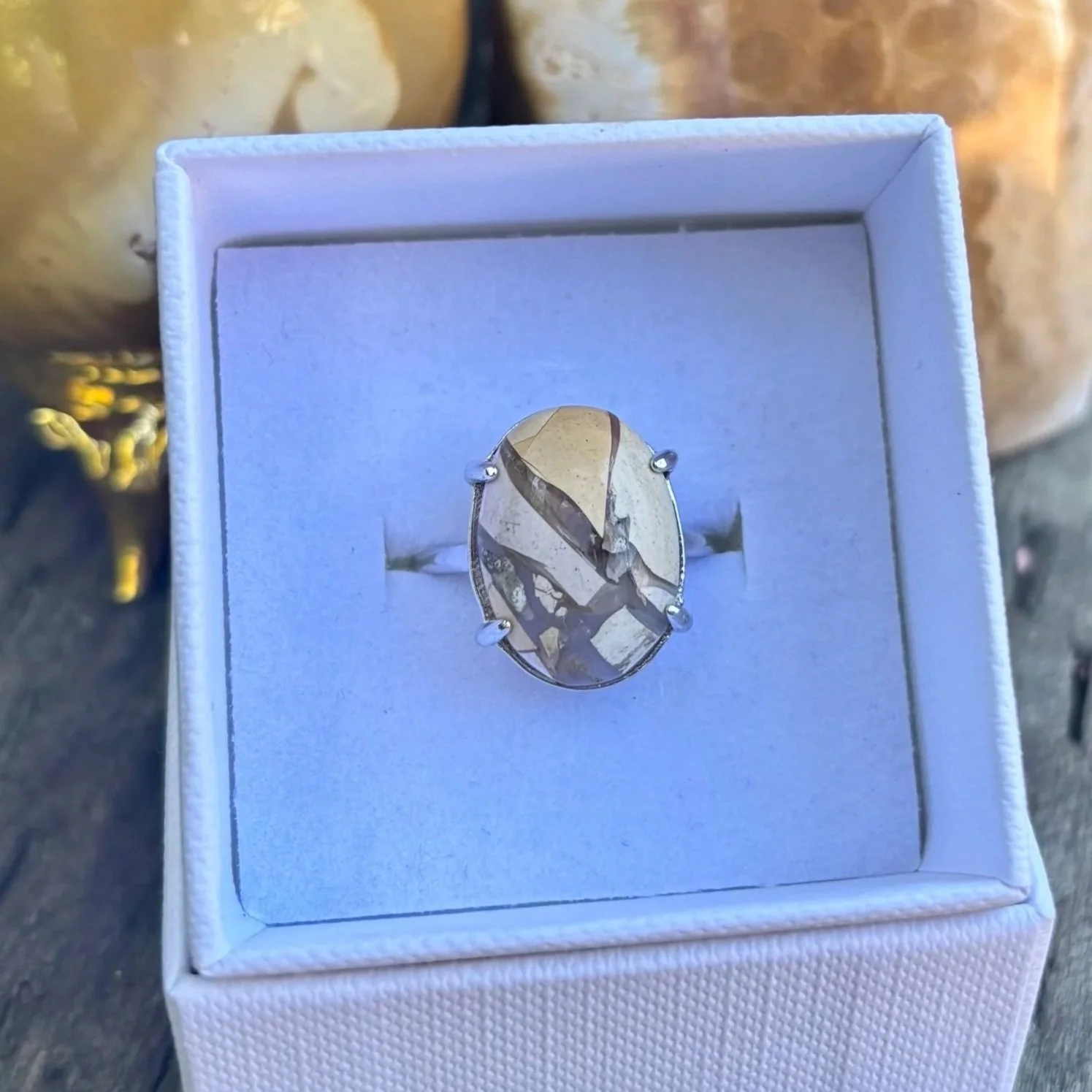 The colour, pattern, and vibration of each one carry something of the earth they came from. My role is to honour that, hand-setting intentionally and individually chosen stones in a way that keeps the design simple and allows their natural beauty to remain the focus.